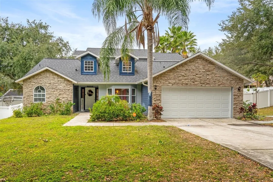 Beautiful 4-bedroom, 3-bathroom, 2 story home nestled in a wooded corner lot in the coveted Sawmill Creek community & is what living in beautiful Clermont is all about. Walk or bike to Sawmill Lake, Roof 2019. This home features a gourmet kitchen with expanded prep and cooking area, with SS appliances, chandeliers & gas fireplace in the family room. Primary bedroom is downstairs as well as one other bedroom. Additional bedrooms are on second floor along with a bonus space that could be secondary living area or private retreat for guests including a private balcony. Yard is fenced and there is a convenient double gate on the side allowing for boat storage inside the fenced area. Great convenience to then access the Clermont Chain of Lakes.