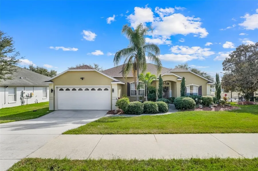 One or more photo(s) has been virtually staged. Your search for an updated Florida home, in an unbeatable CLERMONT location, is over! This home brings single story living to life with the Stetson Model open floor plan and split bedroom layout. The kitchen has been thoughtfully redesigned with white cabinetry topped with crown molding, stone counters, designer faucet, and stainless steel appliances to include a brand new GE refrigerator. Even the stylish black washer & dryer set conveys! The primary bath brings spa-like vibes with soothing tile colors, dual vessel sinks, a perfectly tucked away corner garden tub, and a fully tiled shower. There's less stress in knowing where your "big ticket" items stand: ROOF 2022, HVAC 2019, EXT PAINT 2019, WH 2019. You will enjoy the perks of having a WATER SOFTENER, and if you happen to have an electric car- there's a LEVITON CHARGER waiting for ...