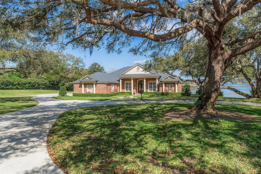 This exquisite multigenerational waterfront estate offers 180 feet of frontage on spring-fed West Crooked Lake in Eustis, blending grandeur with warmth the moment you step inside. Designed for versatility, it features three suites - two of which are exceptionally spacious - making it ideal for multigenerational living, a mother-in-law residence, or a corporate retreat. Executives seeking a distinguished space for meetings or company gatherings will appreciate the separate suite with its own kitchenette and private entrance through the enclosed patio. Every detail reflects superior craftsmanship, from travertine and wood floors to soaring ceilings adorned with elegant double and triple tray accents. Two striking masonry fireplace - one in the family room and another in the expansive 27 x 18 secondary primary suite - add warmth and charm. Constructed with hand-baked brick, 12-inch double-insulated walls, and R-40 ceiling insulation, this home exemplifies exceptional quality. White connected to public water, a private well supplies irrigation for the lush perimeter of 400 mature shrubs, ensuring privacy. This remarkable home must be experienced in person to truly appreciate its beauty and craftsmanship. As stunning as the photos are, it is even better in person, crafted for the discerning buyer seeking unparalleled luxury.