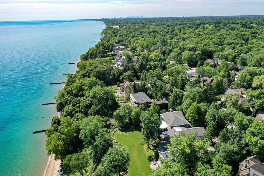 Situated on one of the most desirable locations on the North Shore, this private residence was built for resort style living on a rarely found 1.5 acre lakefront setting. Picturesque and breathtaking, the home was designed with large windows to enjoy views of Lake Michigan from almost every room. Wooden stairs and a lift offer access to a one-of-a-kind elevated beach. The complete bluff restoration was extensively engineered to prevent erosion and create the protected raised beach. The chef's kitchen blends efficiency and beauty. Exposed brick, two large islands, recessed ceiling, high-end stainless appliances, and uniquely decorative lighting are only some of the features this kitchen enjoys. The graciously sized first floor master suite has a vaulted ceiling, handsome fireplace and large windows that allow for ample natural light and calming lake views. The spa-like bath is truly remar...