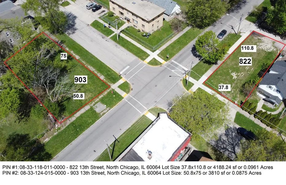 North Chicago! 2 Vacant Lots with separate PIN #'S for sale for 1 Price! Lot 1 NE Corner PIN #1: 08331180110000 822 13th Street, North Chicago, IL 60064 Lot Size 38x101 or 3838 sf or 0.088 Acres 2020 Taxes: $316.68, Lot 2 SW Corner Street address should be 903 13th Street, North Chicago, IL 60064 Not 0 13th Street, North Chicago, IL PIN #2: 08331240150000 If you want to change 0 13th Street to 903 13th Street, you have to do some paperwork with City of North Chicago. 0 13th Street, North Chicago, IL 60064 Lot Size: 51x75 or 3825 sf or 0.0878 Acres Lot Area: 3810 sf or .08 acre 2020 Taxes: $316.68, Both Lots Zoned R3 for Single Family Home. North Chicago School District 187! Nearby parks include Foss Park, Dugdale Park, Boak Park, Twin City Park and Greenbelt Forest Preserve! Close to the Lake! Close to Sheridan Road! Any questions? Give me a call