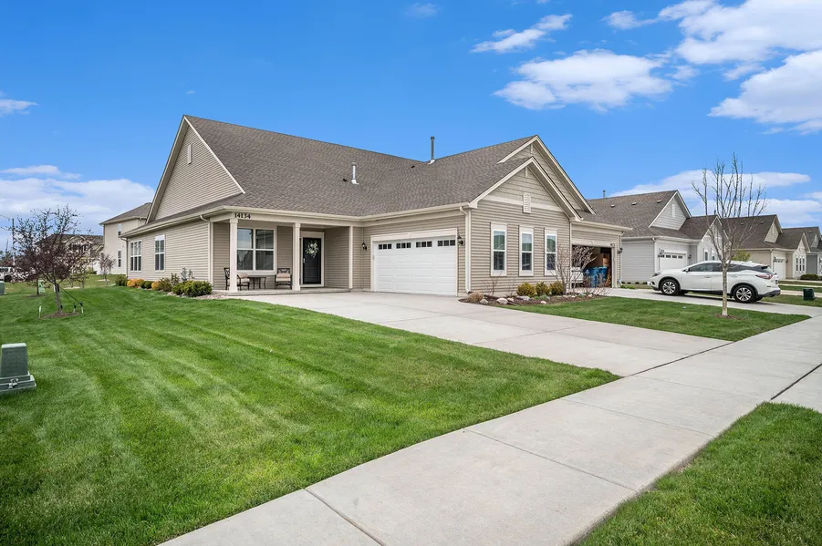 Welcome to 14134 Heritage Way, Cedar Lake, IN 46303--a stunning paired villa nestled in the desirable Rose Garden subdivision. This home boasts 1,825 square feet of thoughtfully designed living space, featuring 2 bedrooms and 2 bathrooms, numerous closets, tall ceilings and a completely finished garage with professionally installed epoxy floor. Step inside to discover an open-concept layout, perfect for entertaining. The kitchen is a chef's dream, equipped with high quality cabinets, quartz countertops, and an oversized island. The living area showcases beautiful laminate flooring, while the bedrooms offer cozy carpeting. The owner's suite is conveniently located off the kitchen and living area, providing privacy and comfort. The 2nd bedroom is situated on the opposite end of the home for added privacy. This home is a Wi-Fi Certified Home Design, ensuring seamless connectivity with features like a wireless Flex system, Wi-Fi smart lock. Additional highlights include an energy-efficient furnace, a side-load garage, and a covered front porch. Enjoy the community amenities, including the pool, which is located directly across the street as well as the walking paths, and more. Located near top-rated Hanover schools, this property offers the perfect blend of comfort and convenience.