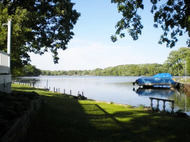 ESCAPE TO THE LAKE!! Resort or year 'round living just in time for summer fun. Boat, ski, swim, fish..affordable lakeside living can be yours. COMPLETELY REMODELED INSIDE AND OUT WITH A HEATED GARAGE TOO! Newer features include: 6 panel doors, gas furnace, central air, stamped concrete patio, front deck, covered deck lakeside, flooring, baths,countertops, windows, fixtures, siding. Living room with newer carpet. Eatin kitchen has range, refrigerator,wood cabinets, window over sink views lake. Spacious family room w/wood laminate flr, light ceiling fan, patio doors open to covered deck and lake front scenic views. Master bedroom has roomy wall closet and private half bath. Second bedroom has 2 windows, carpet, wall closet. Full bath is all new. Water views front and back. Detached garage with auto opener, gas heater, 220 service, built in 2007. COME AND EXPERIENCE THE TRANQUILITY OF LAKESIDE LIVING. THE VIEWS ARE FANTASTIC!