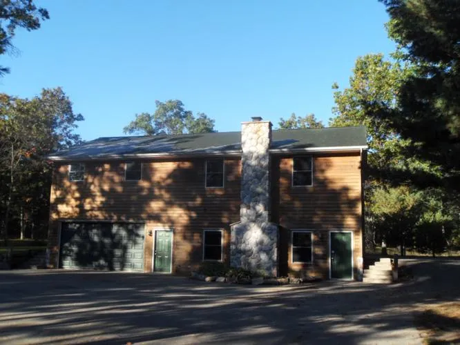 Newer ranch on 10 acres close to the moterized vehichle trail head. Family room in the basement with a fireplace, deck off the dining room, wooded land.