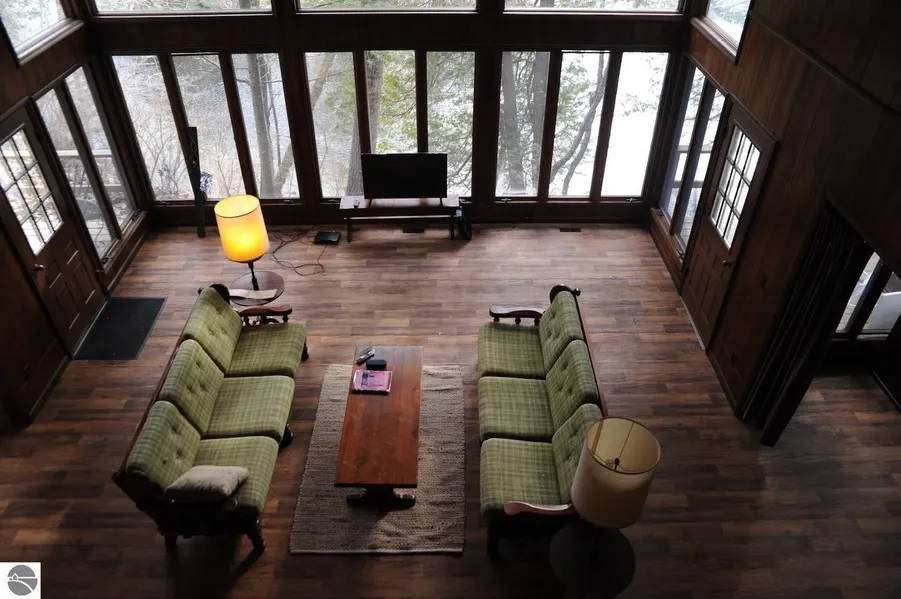 Cabin #4 is a well-maintained wood frame building built in 1980 chalet style by the current owner. It has never been listed for sale. Electric power is underground. The cabin has a well, septic system, and propane tank and direct access to South Mac Road, which is plowed in winter and maintained year-round by Lake County. It was built chalet style in 1980 prior to the Natural Rivers Act, when the setback from to the river was 40'. That is 110' closer to the river than is now allowed under Natural Rivers zoning. It is grandfathered, and may be replaced or expanded up to 50% without a zoning variance. The main floor has a two-floor high great room above the river, a kitchen and dining area with a built-in dishwasher, a den or bedroom, a full bathroom, and a utility room on the main floor. The upper floor has two full bedrooms and a full bathroom, with an open area above the living room b...