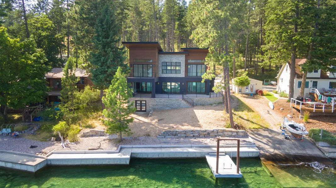 Lake Living Perfection on Finley Point, Skidoo Bay. Stunning form meets effortless function with this sleek and stylish brand new home, completed in summer of 2020. Exterior of the home is an architectural masterpiece contrasting cedar, gun metal, and cultured stone siding with shed roof. Dramatic picture windows reflect the splendor of Flathead Lake and the Mission Mountains. Every detail has been surpassed to enhance your enjoyment of lake living and entertaining. Amenities include outdoor kitchen with fireplace and TV hook up, chef's kitchen, open living with custom fireplace, 5 bedrooms (including 2 master suites), 6 bathrooms, 3 sets of washer/dryers.
