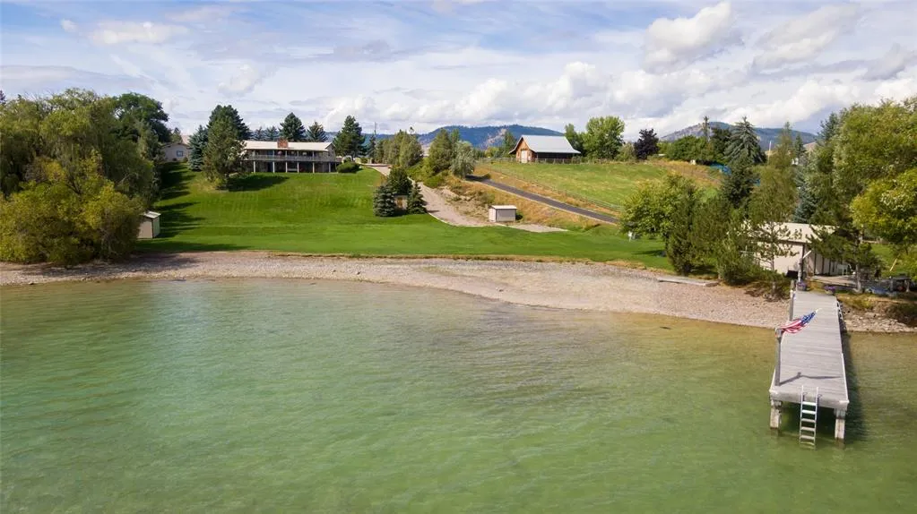Are you looking for a lake home with plenty of room to roam, both inside and out? Visit this lovely lakefront offering! The property boasts 194 feet of pebble frontage, with a gentle lawn to lake slope on 1.9 acres. The home, which has an open easy flow and stunning wood features, offers 4 bedrooms, 2 of which are ensuite. There are massive living areas on both levels, and storage galore. The primary "wing" is on the main level, and separate from other bedrooms. Kitchen is open to living/dining for easy entertaining. Exterior offerings are many, including wraparound deck, covered patio on lower level, lawn irrigation from the lake, multiple storage sheds, circular driveway with overflow parking and detached 5-car garage/carport. The lakefront is expansive, with a large dock and cheery lake cabin for bunking, storage, extra fridge, etc. Gorgeous lake and mountain views from every window, 5 mins to town...this is fabulous lake living!