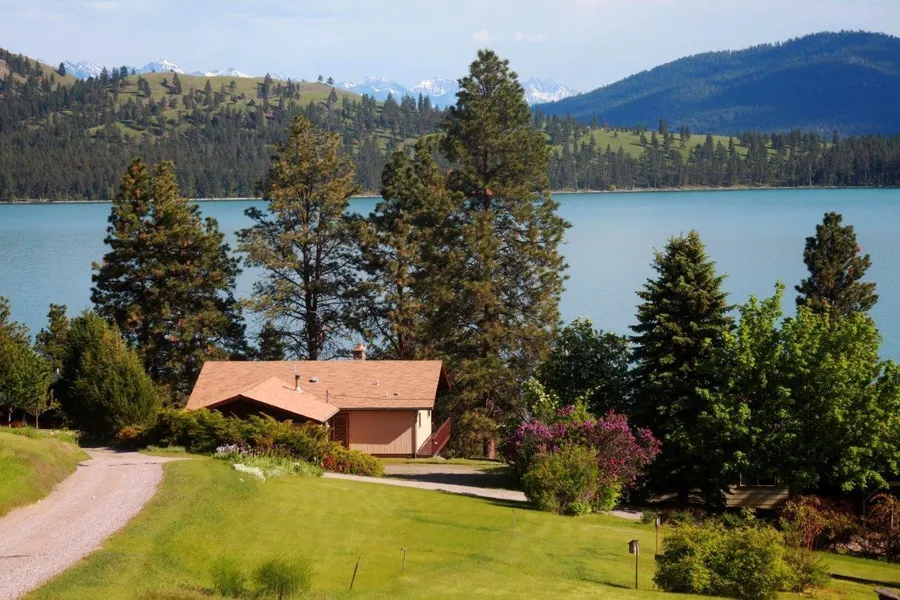 Views of Wild Horse Island from this Flathead Lake retreat. Over one acre with 100' of lake frontage. A gentle slope leads to a boat house and beachfront with fire pit. The covered deck above and patio below offer beautiful lake and mountain views. Mature trees, lilac hedge and landscaping round out the yard. The comfortable home has 3 Native Rock fireplaces, a main level master suite with views of the lake, and a living room with lake views that leads to the covered deck. The walk out lower level is the perfect guest area with a kitchenette, family room, fireplace, bath and 2 bedrooms. A great family get-away or full time residence. The enclosed boat house has a winch, sits directly on the lake and comes with a boat.