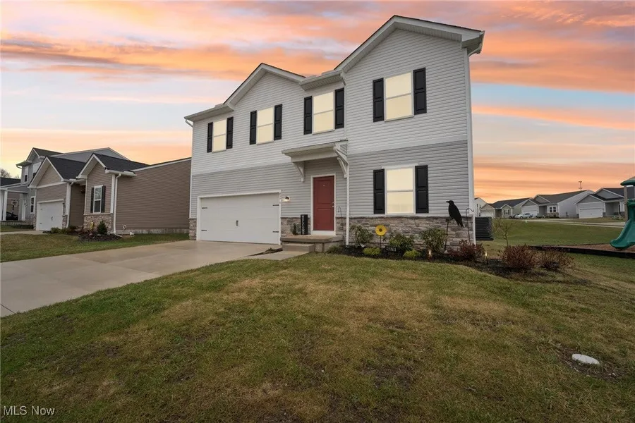 Waiting for the rates to drop? Here's your chance to take advantage of an assumable 1% interest rate USDA mortgage!*** This MOVE-IN READY 2023 built home has an open floor plan, 2486 square feet, 5 bedrooms, and 3 full baths. This home has major curb appeal with exterior stone, carriage style garage door with black hardware, and vertical siding accents! Having a 1st floor bedroom with full bath is perfect for guests staying the night. Versatile space off the entry can be used as a home office, playroom, or a formal dining room. This well-appointed kitchen will definitely impress. Stainless-steel appliances, granite countertops, oversized island with seating, white cabinetry with tasteful hardware, and a huge pantry. Enjoy cozy evenings in front of your gas fireplace watching your favorite show or reading a book. Retreat after a long day to your large primary suite with full bathroom, walk in shower, and private water closet. The primary suite has not just 1, but TWO walk-in closets! No more carrying laundry up and down the steps with your 2nd floor laundry! The loft area is the perfect flex space to use as an office, gaming area, or a quiet retreat. New landscaping, composite decking, and retractable awning complete this dream home. Booth Farm is just 15 minutes away from all major shopping in Mentor, and 30 minutes from Cleveland. The community amenities are abundant with a playground, pavilion, and walking trail. Transferable 10 year warranty included!