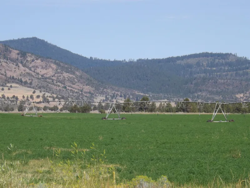 880 deeded acres 12 miles west of Lakeview, OR. 322 acres of water rights with 302 from one well and 20 acres from Lakeview Water Users which is flood irrigated. Two windshield wipe pivots and three wheel lines on property. The owners are currently irrigating about 245 acres. Most is in older alfalfa which is getting more grass in it. The property was leased this year and the lessee has just run cattle on it and did not haying. There is room for another pivot and then the water rights could be utilized to a maximum.