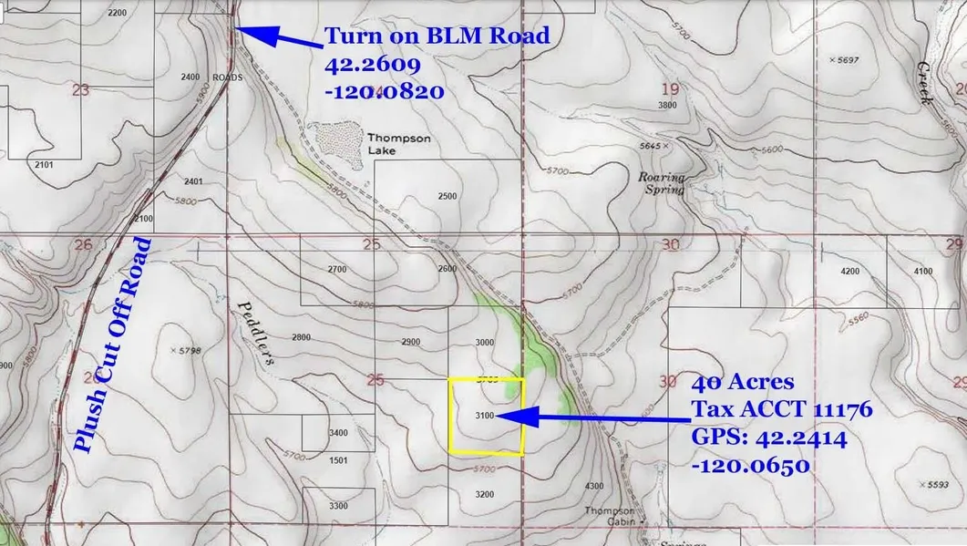 40 Acres light brush with numerous trees. Access is from the Plush cut-off road. Turn at 42 .2609, -120 .0820, go past Thompson Pond and Use GPS 42 .2414, -120 .0650 and those coordinate will take you to the property. The road towards the property. Snow right now but when conditions get better I will ad numerous photos. This area is remote, off-grid and an excellent location for a hunting camp or riding your off road toys. Fence it and raise cattle. This is cattle country.