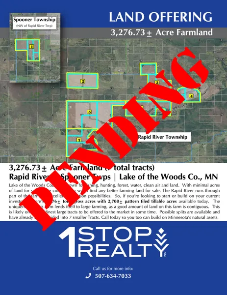 PENDING . . . Lake of the Woods Countyknown for fishing, hunting, forest, water, clean air and land. With minimal acres of land for sale in the county, you wont find any better farming land for sale. The Rapid River runs through part of the farm for excellent recreation possibilities. So, if youre looking to start or build on your current investment, heres 3,276 total gross acres with 2,708 pattern tiled tillable acres available today. The uniqueness of this farm lends itself to large farming, as a good amount of land on this farm is contiguous. This is likely one of the finest large tracts to be offered to the market in some time. Possible splits are available and have already been divided into 7 smaller Tracts.