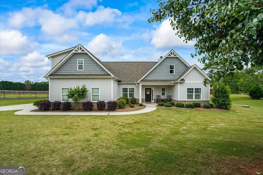 $7,500 CLOSING COST CREDIT: A total credit of up to $7,500 is available to qualified buyers to be used toward closing costs when combined with our preferred lender. This credit is offered with an acceptable full-price contract to purchase. Conditions apply; contact the listing agent for details! Beautiful Craftsman-built home featuring an open concept floor plan on a fairly level 2.48 acre lot! Enjoy relaxing on either the front or rear covered porch. The inviting foyer leads to a living area with vaulted ceilings, a custom wood mantle, and a brick hearth for the wood-burning fireplace. This space flows seamlessly into the open dining room, which has a custom ceiling, and the spacious kitchen with a low seating breakfast bar. The entire floor plan is filled with natural light. The home has a split bedroom layout, with the owner's suite on the main floor complimented by two secondary bedrooms and a full bathroom. A hidden staircase leads to a large fourth bedroom with a full bathroom upstairs, making it a perfect teen suite. The kitchen and bathrooms feature granite countertops, while the kitchen also boasts white cabinets and subway tile. The impressive custom shower in the owner's ensuite comes equipped with a rain head, bench, niche, and frameless glass with door. The main floor has smooth ceilings that reach 9 feet, and the flooring consists of a combination of LVP, LVT, and carpet throughout. There are ample closets in every room, and the side entry garage has direct access to the laundry room, conveniently located near the kitchen. This home is entirely electric and energy-efficient. Security system with cameras and upgraded wireless capable garage door opener remain with the sale. Located near Rock Springs Church and School, as well as nearby walking trails and parks. Call for a private showing! Updated/Current Survey recorded in Sept 2025