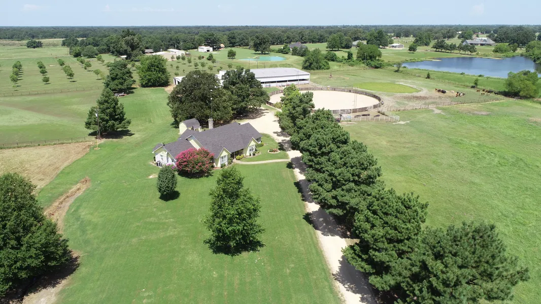 As you drive up the tall pine tree lined driveway and pass the house, the lane continues past a large round training pen to the horse facility with a another covered training arena. This fully equipped facility barn has a total of 17,280 sq ft, which includes 20-slide-door horse stalls, an extra concrete stall with drain for washing, and a large walk-in closet for feed storage, and tack. A 20 ft alley separates the stalls from the 12,000 sq ft covered training arena, just waiting for a cutting horse trainer to get started. Right outside the barn, a 150 ft diameter round pen can be used for sorting or groundwork or both. In addition on the East and West sides of round pen, there are cattle holding/working pens with a chute and load out alley.