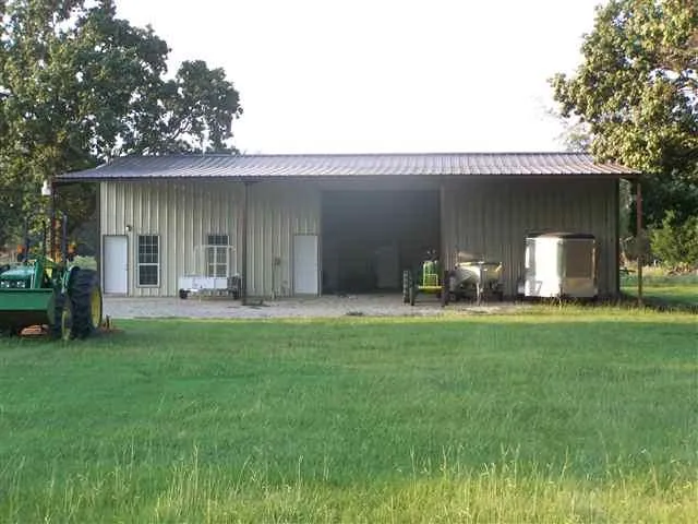 Pretty 63 acres with large metal shop converted to living quarters featuring bedroom, bathroom, kitchen and upstairs gameroom - centrally heated and cooled. New fence. Pond and creek. Great hunting!