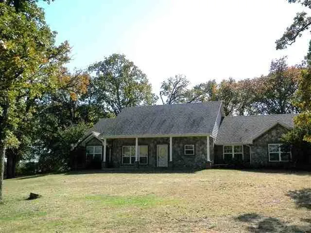 Set back off the road and hiding up on a hill is this custom 3/2.5 with stone accents surrounded by 42+ acres of gently rolling land, tall trees and stock ponds. Spacious floor plan featuring large living area with gas log fireplace, pretty kitchen with granite counter tops and tile flooring, breakfast room with bay window plus formal dining. Master suite features 2 walk-in closets, jetted tub and separate shower. Utility/mud room has lots of storage, 3/4 bath and room for a freezer. Nice shop with concrete floor, electric and water.