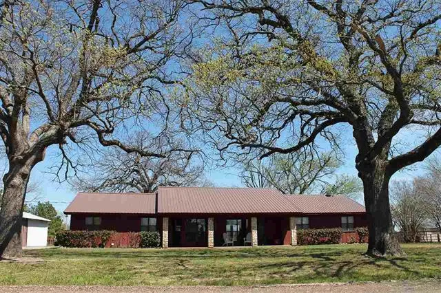 Cedar/redwood home with stone accent pillars plus metal roof setting among tall oak trees. Extremely well maintained. Laminate flooring in kitchen, living and walkways. Recent carpet. Updated kitchen with new counter tops, paint, fixtures, over-sized bath with dual dressing areas. Huge covered front and back porches. 2 Acres with pipe fencing, 30x30 metal shop and 30x40 barn.