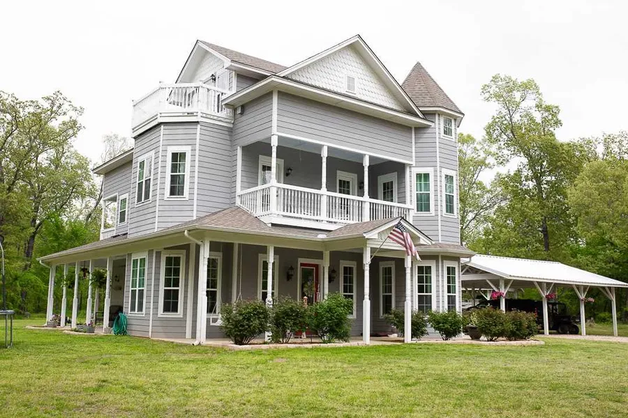 Victorian & Elegance collide! This custom built 3 story home is just the right combination. From the gated entrance you can not see this manor awaiting in the tall trees to give you that extra privacy we all desire! 1st floor features main living, dining and kitchen areas, and a full bath. There is also a study/office with beautiful glass doors. Kitchen features large breakfast bar, gas stove, wine cooler, and custom almond cabinets and granite counter tops. Small breakfast nook for morning coffee. 2nd floor are 3 bedrooms (including master) and 2 full baths. Master bath has large glass/tile shower, 2 vanities, dressing area and large walk around closet. 3rd floor is an ideal gameroom/2nd LA and a 4th bedroom with full bath. Off game area is a cove perfect for his "man cave". Outside features a 40x50 metal shop, 3 doors, electricity, 27x27 carport and a 27x39 carport. There are 25+ acres...
