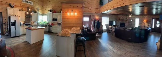 BEAUTIFUL BARDOMINIUM SITTING ON 13 ACS. THIS 3/2.5 HOME WITH NATURAL COLORED SHIPLAP, HAS FARM HOUSE FLARE WITH MODERN AMENITIES. THE OPEN FLOOR PLAN IS GREAT FOR ENTERTAINING. THE KITCHEN IS EQUIPPED WITH STAINLESS APPLIANCES, GAS STOVE, GRANITE COUNTERTOPS, BREAKFAST BAR, WALK-IN PANTRY & ISLAND. THE LIVING ROOM IS ACCENTED WITH WOOD FROM TOP TO BOTTOM, STONE FIREPLACE W/ GAS LOGS. MANTLE AND KITCHEN ISLAND ARE HAND MADE FROM LOCAL CEDAR TREES. THE PRIVATE PRIMARY BDRM & BATH, WALK-IN CLOSET & SPACIOUS DEN OCCUPY THE ENTIRE 2ND FLOOR; 2 BDRMS W/ JACK & JILL BATH, ADDITIONAL 1/2 BATH ON 1ST FLOOR. THE OVERSIZED LAUNDRY/MUD RM INCLUDES DOGGIE SHOWER. THE 30X40 SHOP WITH 2 AWNINGS AND CARPORT INCLUDE LIVING QUARTERS W FULL SIZE BATH. 700 SQ FT OF PATIO OFFER A GREAT VIEW OF THE STOCKED POND. 10X20 SHED.