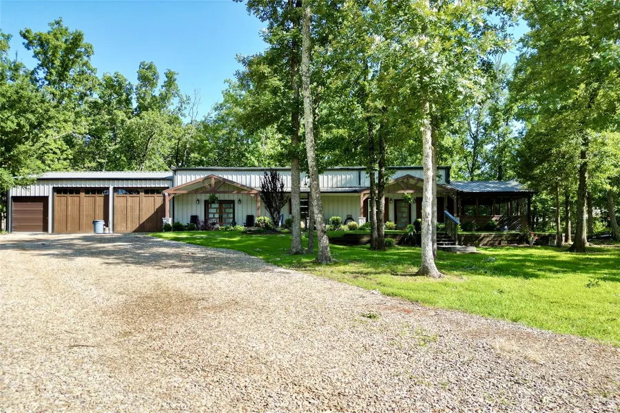 Park-like grounds, trees and a half acre lake! Woods for hiking, open areas for activities, and back off the road with quiet and solitude. An open floor plan living area, vaulted ceilings, dramatic rock fireplace, dining area and blue spruce wood accents. Stainless appliance kitchen has a 8' island breakfast bar, abundant cabinetry, gas cooktop, double ovens and more. The primary suite has 10' ceilings and double atrium doors which open to the porch and nature views. It also includes a garden tub ensuite, separate custom shower, dual sinks and a cheery flower wall mural. The upstairs bedroom and anteroom can accommodate multiple beds for all the kids, the separate game room features a colorful wall mural plus a blue spruce accent wall. Outside are: a screened side porch, 40' front sittin' porch with a panoramic view of the grounds and lake, and 29 x 36 multiple car shop garage--ideal for storing utility vehicles, etc. Claim this great, fun place to live or for weekend getaways! BUYER AGENT FRIENDLY!
