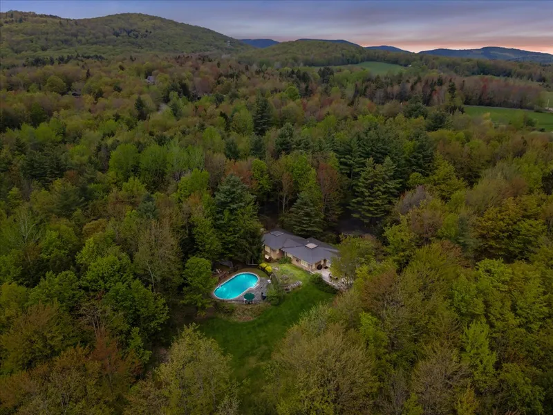 The home's centerpiece is a large living room with a striking stone fireplace, providing a warm, inviting atmosphere. A wall of French doors in the living room opens to a large deck, perfect for social gatherings or quiet evenings enjoying the fresh mountain air. The home features a brand-new metal roof, ensuring durability and peace of mind. Next to the living room, a perfectly placed kitchen offers both privacy for cooking and connectivity to the living space, ensuring you remain a part of any gathering. The home's layout includes a private bedroom wing with a primary bedroom featuring an en-suite bathroom alongside an additional guest suite, five further bedrooms, and four bathrooms, making it well-equipped to accommodate family and guests comfortably. Downstairs, the home continues to impress with a versatile entertainment area featuring a game room and a small kitchenette, making it an excellent space for all ages. The outdoor area includes a pool with a brand-new liner and heater, surrounded by beautiful stonework, which is ideal for relaxing after outdoor activities. The property also has a detached garage with a room for storing all types of gear. Located on over 6 acres, the blend of wooded areas, lawns, and potential for expanding views adds to the charm of this welcoming home. Topping off this quiet enclave, you are just a few short miles to Historic Stowe Village, The Rec. Path, and Cady Hill Mt. Bike trails. Plus, easy access to Mt. Road and Stowe Mt. Resort.