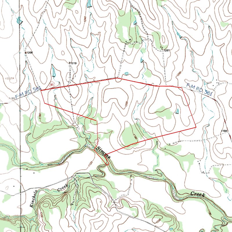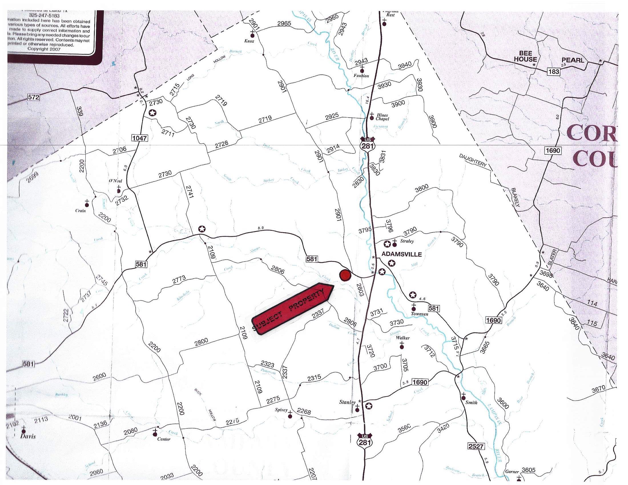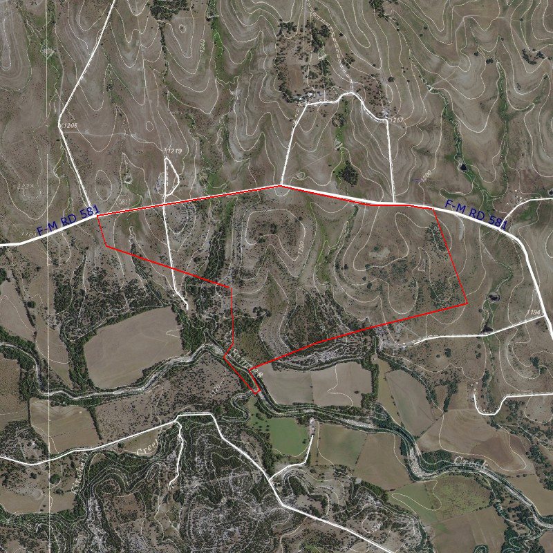 This beautiful 513.780 acre ranch is located on FM 581 about 4.5 miles from state highway 281, and 16 minutes north of Lampasas . This great location allows you easy access to Lampasas, Lometa, and Gatesville. Austin, Temple, and Waco are about 1.5 hours away. The ranch has about 1.5 miles of paved FM frontage, which provides easy access to all parts of the ranch.