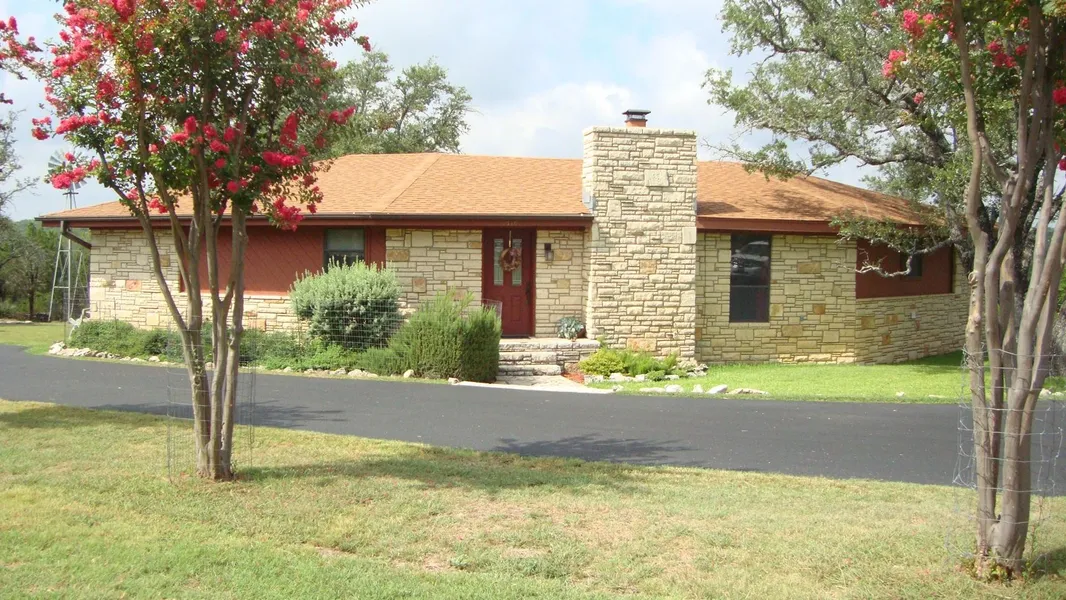 Own a piece of the Hill Country! This beautiful 3/2/2 Stone and Cedar home sits on 3 Acres, nicely landscaped with mature shade trees and plenty of Crepe Myrtles line the asphalt driveway. Includes an oversize workshop with covered area for a motor home, the work shop (2,025SF )also has a 40x16 air conditioned room. The open floor plan features Cathedral ceilings lined with Knotty Pine, a Mesquite & tile fireplace. The large patio out back offers beautiful views of the Hill country. Master bathroom offers seperate vanities with an oversized soaking tub surrounded with unique Knotty pine also. The updated, remodeled kitchen has Silestone countertops with plenty of cabinetry