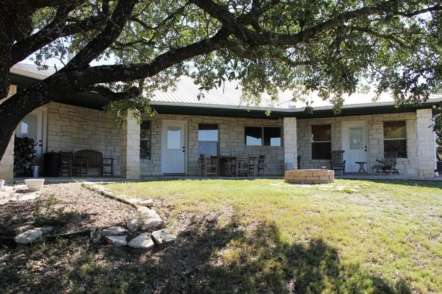 The backyard features a beautiful view from the patio which also has a fire pit for great outdoor enjoyment. You can sit under the covered porch and see the Texas Hill Country for miles!