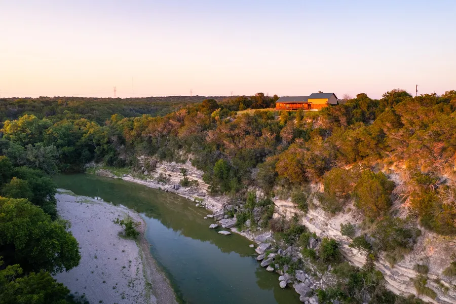 Stone Home: The newly built home is perched atop one of the many high points on this expansive property. The home has roughly 2,000 sqft of living space, including 2 bedrooms, 2 bathrooms, utility room, and an office area. With longevity in mind, the home exterior is built using state of the art insulated concrete foam walls and imported Oklahoma Stone. The 18 ft x 25 ft covered porch features breathtaking 180-degree views of the rolling hills and pristine river. The living area also features a 40 ft x 30 ft covered area for parking with a storage room that can easily be converted into a living space.