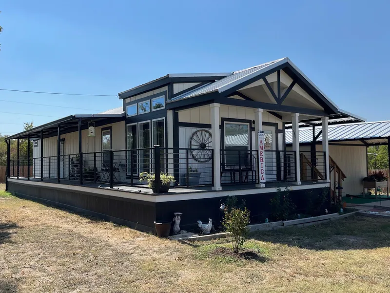 Absolutely adorable! Almost brand new and in almost new condition! Spacious 2 bedroom, 2 bath Champion Home by Titan Factory Homes, complete with a wonderful inviting front porch and side decking providing ample outdoor living. This home has an open floor plan with a Country Farmhouse style. The living area has nice large windows with lots of light and is open with the kitchen, which has a large center island with barstools, also has a small coffee bar! Lots of storage as well!! The master bedroom is quite large and has two closets and a built in storage. The master bath has a double vanity, nice walk in