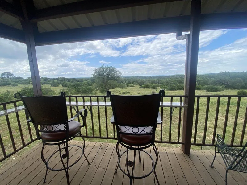 Possibly the most inviting feature of the property is the 800 square foot barndominium resting on top the 800 square foot shop. The full aminity house sits 12' above the ground with a complete 10' wrap around porch. These 360 degree hill country views are extraordinary! Enjoy sunrises and sunsets in the hot tub or outdoor seatin...