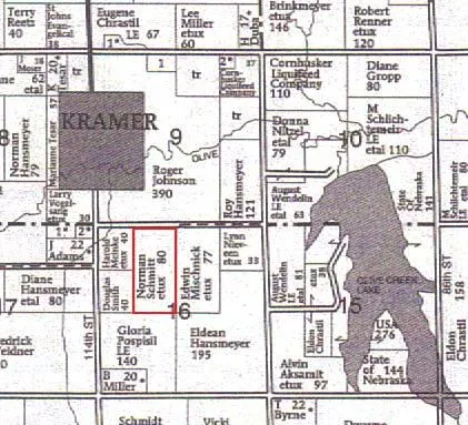 SOLD AT AUCTION JANUARY 12TH 10:00 A.M. AT KRAMER COMMUNITY HALL, KRAMER NE. This farm is currently coming out of the CRP program and is a gently rolling piece of land. The land has an active house well on the property and had provided for the Schmitt family for a number of years until a fire forced them to move to Crete, NE. This in another great opportunity to expand your farming operation with a productive piece of dry land farm ground and we hope to see you at the auction. 15% down day of auction, upon signing the Purchase Agreement, balance due on or before 30 days (approximately February 12, 2012). Title insurance & closing cost will be split 50%-50% between buyer & seller. 2011 and all prior taxes will be paid by the seller. 2012 taxes will become the responsibility of the buyer. All other announcements at the auction take precedence over printer advertising. Darryl Novak and United Country First State Realty are representing the sellers in this transaction.