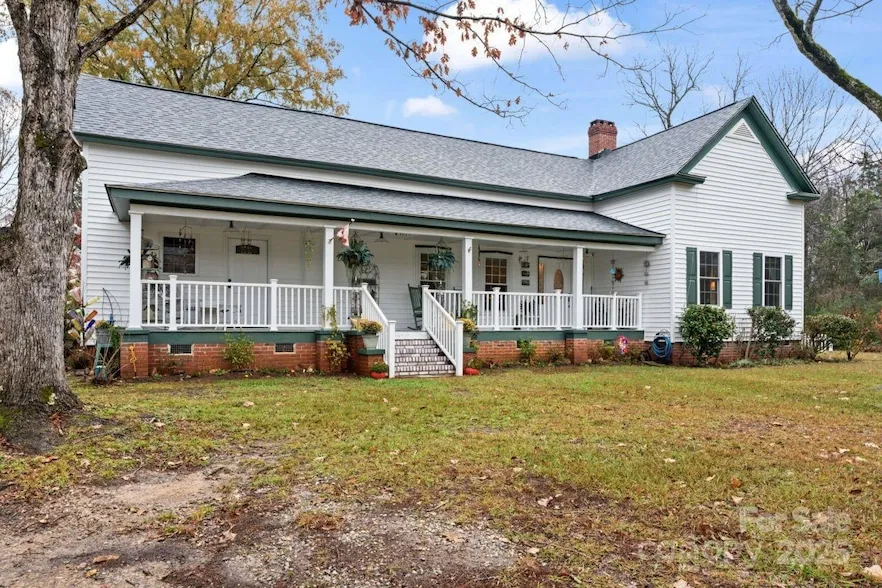 The "Old Homeplace" as it was called is a true Farmhouse w/+9 acres and beautiful Carolina rain porch, est. built in 1880's. This 2 Bd., 2 bth ranch is loaded with character with gas logs in dining and living rooms, wide plank pine and oak floors, several rooms with 12.5 slated ceilings. A huge feature is the 2400 unf. sq. ft. detached garage (built 2001) and workshop could be partially converted into 2nd living quarters or AirBNB. In the Farmhouse, many updates have been made over the years- New Roof (July 2024), Kitchen Remodeled (2013) and added mudroom and screened porch, Rewired Home (2001), Replumbed Home (2005), Remodeled Primary bedroom and primary bath, reconfigured footprint of 2nd bedroom to create hallway w/linen closet and 2 walk-in closets, added energy efficient windows (25) and doors (4), added vintage hardware, HVAC w/Merv 16 upgrade (2012-2013), upgraded septic drainage field (2022), Vinyl Siding, new porch railing and lighting(2024), Gas Water Heater (2022) & more.