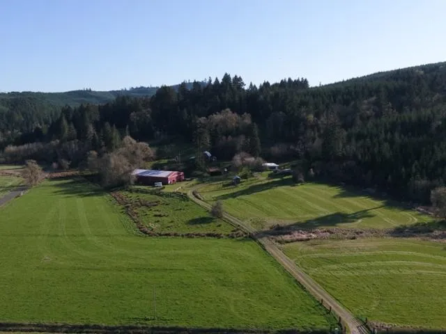 This is a tiered parcel with plenty of flat, useable ground and Western Oregonians with livestock will tell you this is the best topography combination for animals in winter and summer. The homesite is slightly elevated and faces north with the hillside behind it and a view like an amphitheater to the north. There are some level areas on the hill and lots of trees but open enough for feed to grow. There are beautiful springs on the property, a year-round pond, and drainage is controlled naturally down towards the road. The bottom ground is in hay crop and nicely managed by a farmer currently renting the fields. The property is divided by Grimes Rd. with hay fields on both sides and plenty of access gates.