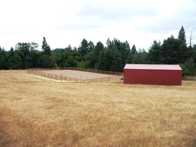 DRESSAGE ARENA is 150' x 72'; is a year round, outdoor; excavated and designed for excellent drainage with slant and layers of large rock, small rock, and approx 4" of sand. Surrounded with nice 3 rail built from 4" x 6" pressure treated boards, and a well thought out pressure treated surround to keep your sand in place.