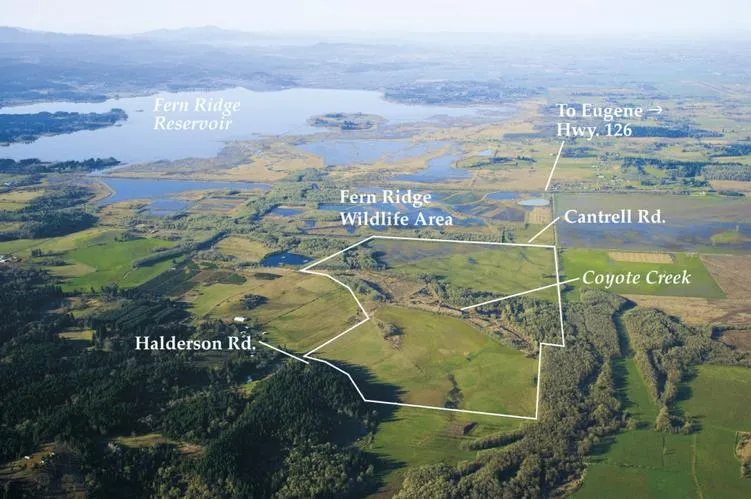 This 310 acre farmland property is located five miles west of Eugene, along Coyote Creek. It is next to both the Coyote Creek Nature Trail, part of the Fern Ridge Wildlife Area maintained by the Oregon Department of Fish and Wildlife, and the Coyote Prairie Wetland Mitigation Tract, owned by the city of Eugene. The irregularshape tract has frontage to the north along Cantrell Road and to the southeast along Halderson Road. Coyote Creek bisects the property and is tributary to Fern Ridge Reservoir.