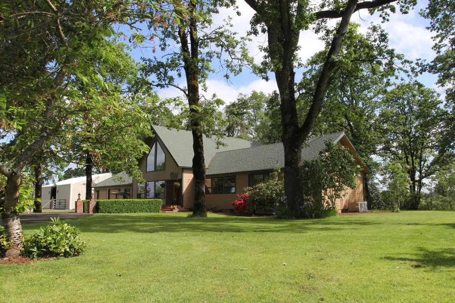 Pretty yards with primarily easy mow landscape under an umbrella of giant oaks. A big garden area with raised beds, blueberries, raspberries, grapes, apples, and a lilac tree all with beautiful sunset views. Level useable, small pasture area, with gravel parking area for trailers or extra vehicles. 2 separate tax lots, and zoned EFU.