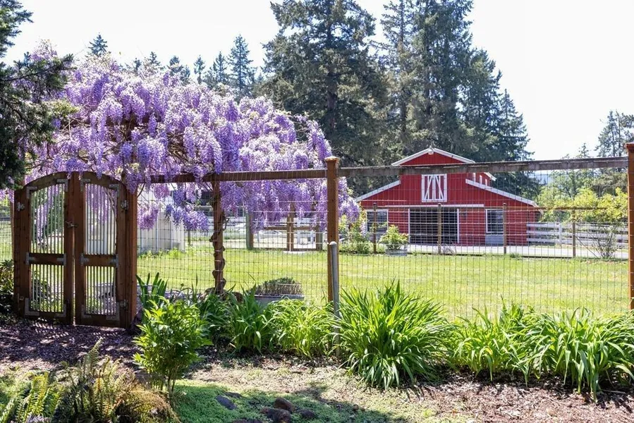 The fenced garden offers a greenhouse and includes established raspberries, blueberries, and beautiful flowering wisteria and clematis. Fruit trees include apple and cherry.