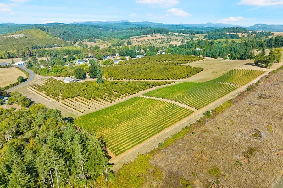 Set in the foothills of the Willamette Valley, just outside of Eugene, lies this idyllic 39.26 acre Estate property featuring 2 homes, a top-producing Pinot Noir vineyard, a Filbert Orchard, and stunning 360-degree views of Fern Ridge Reservoir, Franklin Valley, and the Willamette Valley.Whether your dream is to live the vineyard lifestyle, have horse property, or live a life of relaxation away from the hustle and bustle of city life, look no further, as opportunities abound here. The pristine 5-acre Pinot Noir vineyard, located in the Long Tom AVA, was planted between 2007-2009. The grafted vines are Pommard, Dijon 115, and 177 clones. Continue selling the highly sought-after grapes to local wineries, or be a vintner and make your own wine and possibly convert one of the buildings to a winery/tasting room, or build your own. The location is ideal as Territorial HWY is the primary transit route through Oregon Wine Country. The Vineyard is protected by an 8' deer fence that surrounds the entire property and has Bird Guard electronic scare technology. The 21 acre Filbert Orchard consists of 16 acres Barcelona trees and 5 acres of Ennis, currently producing a nut yield of 24-26 tons. Two homes on the property include an 1172 sqft cozy bungalow/farmhouse with 2 bedrooms and 2 baths and a newly constructed garage. The 2nd home is a one bedroom and one bath; it's a versatile space primed for multiple roles, currently serving as the caretaker's residence and holding the potential to become a replacement dwelling if so desired. An amazing possible build-site with breathtaking panoramic views of sunsets and sunrises provides an ever-changing canvas overlooking the vineyard and orchard below.Included is also a 4800 sqft 2 bay barn with full shop, unfinished upper level 440 electrical services, an outbuilding, and 2 wells that serve the property. One well is for the homes and one for irrigation.