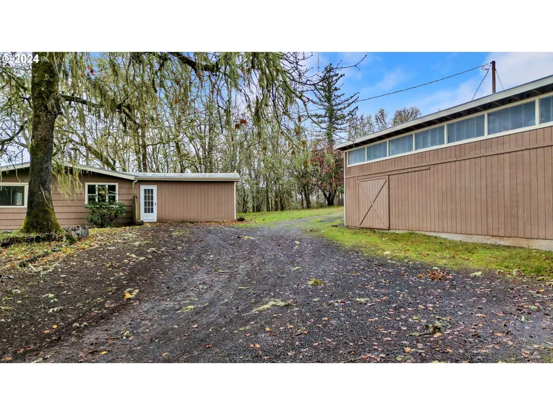 Welcome to this private retreat! Nestled on just under 5 acres, sits a 3-bedroom, 2-bathroom main house, two finished 20X30ft outbuildings, fruit tree orchard, fenced garden area and plenty of room to roam. The 3bed 2bath comes with a bonus room and separation of space for possible mother-in-law-suite setup. One 20x30 building has been finished as a music studio, complete with wall-to-wall soundproofing — ideal for musicians or artists. The second 20x30 outbuilding is equally versatile and could easily be converted into a guest house or ADU, offering the perfect setup for additional living space, rental potential, AirBNB, or a private home office. This property is powered by 600 Amps of electricity to supply all your hobbies and ventures! Newer roofs on all 3 structures. Only 15 minutes to downtown Eugene. Bring your hammer, creativity and an offer to make this property your own private retreat!