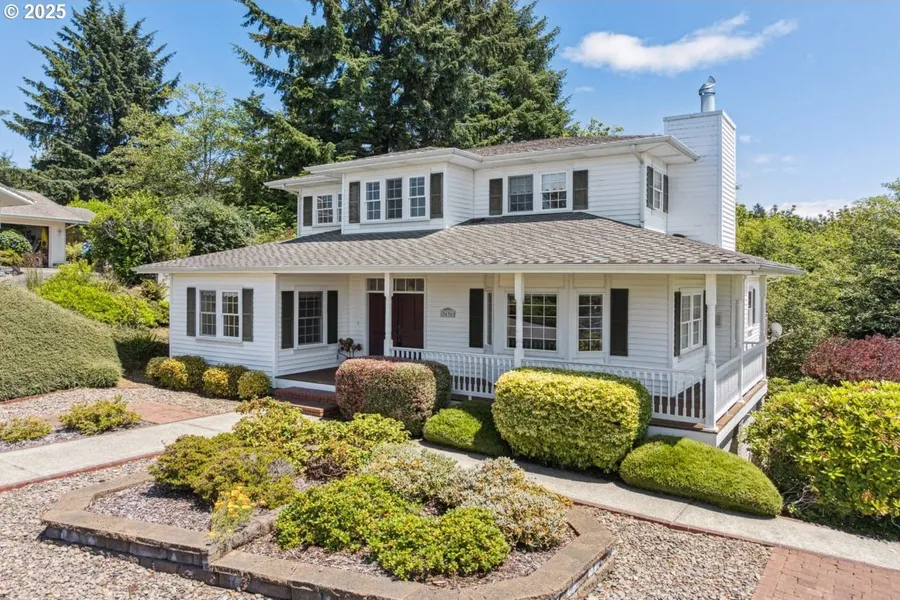 Sitting atop the gated community of Rhodo View Dunes, this custom built home is eye catching inside and out. The stately presence hits you at first sight with it's traditional shutters, wrap around porch and well maintained landscape. Step inside the double doors to the grand staircase and entryway featuring hardwood floors and built in features. There are two bedrooms on the main floor, including the primary suite and and additional bedroom upstairs with the library and 3rd full bathroom. A spacious living room with high ceilings, wood burning fireplace and plenty of windows are the centerpiece of the home. A large kitchen with an induction range, double ovens and ample cabinetry sits just off the dining room, where both face a peaceful wooded setting. The back deck takes advantage of this secluded space, with a whole different feel of outdoor living space. The garage, nicely tucked und...