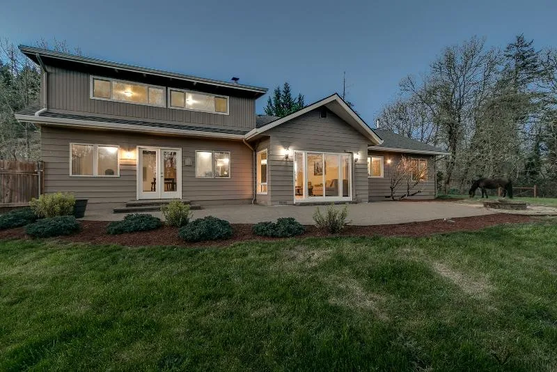 The backyard is a great place for entertaining with a beautiful umbrella of trees. Filtered views of the back field and sounds of the creek create a relaxing environment. There is a firepit and it is fully fenced for dogs.
