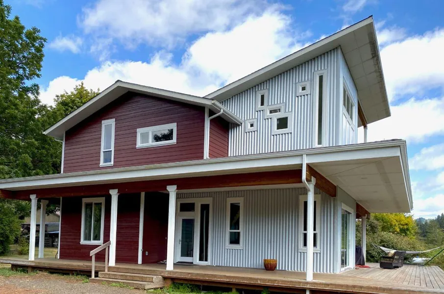 The three bedroom, three bath house has total living area of 2,408 square feet. It was built in 2016, designed by Willard C. Dixon, Architect, based in Eugene. The home was featured in 2017 Eugene Register Guard article Indoor-Outdoor Dream on Island in the Stream. It was designed to blend historic farmhouse with contemporary elements. For group entertaining, the home has two-story roll-up garage-style glass doors, providing maximum light and ventilation, and opening to a wraparound deck, and a second kitchen, outdoors.