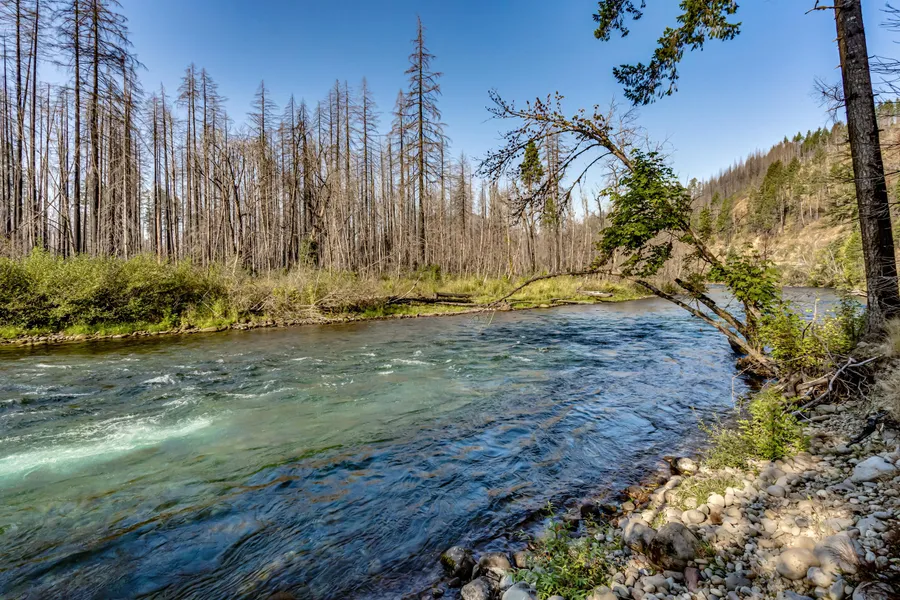 River frontage is approximately 500 ft! F2 zoning does not permit manufactured homes, tiny homes, or single-family homes but there is room for a 40 ft RV turnaround and fire pit so use it as an amazing campsite! Private location at the end of the street. Scenic old-growth trees and native ferns and shrubs. The 0.98 acres consist of two separate portions under a single tax ID number as you can see in the maps provided. Electric pole there but no meter. No well or septic. Go take a look!