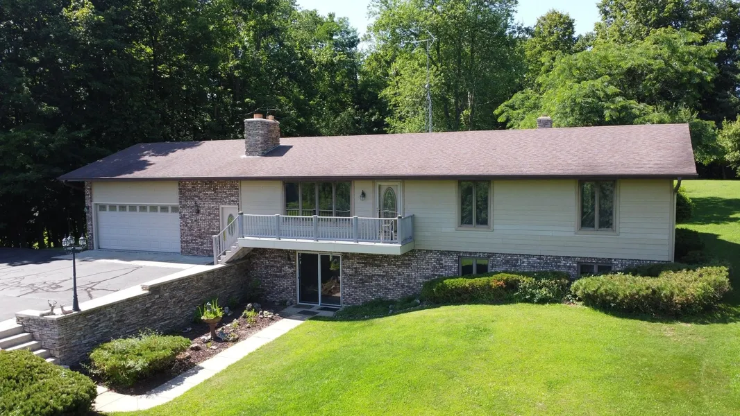 Welcome to country living! This three bedroom home with two bathrooms sits on the hilltop of a five acre parcel giving you a great view of the property. All bedrooms are on the main level as well as a large living room and recently remodeled kitchen and dining area with a patio door leading to a deck. The lower level has a large family room including a bar area and freestanding wood stove and an additional bonus room with built in gun rack. A large yard includes many apple trees, a patio area and fenced in garden. A 30'x25' outbuilding with cement floor could be used for storage or a small hobby farm with part of the land being field and part being wooded.