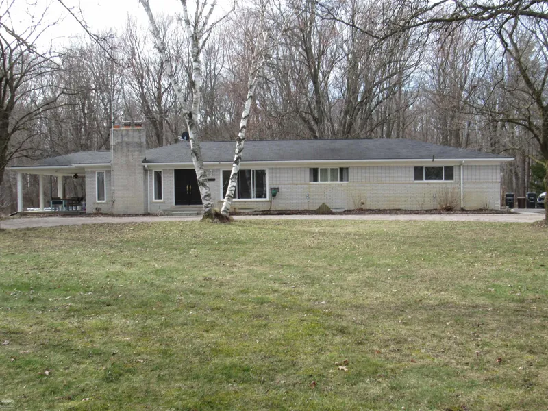 All brick ranch in a great wooded location with a stream in back. Three or four bedroom home with den plus family room with fireplace and door wall to covered porch with view of the wooded yard. Large full bath with shower and whirlpool tub on the main level. Basement/lower level with full bath/shower, bedroom, daylight windows. Engineered septic field. Home is set back from road with circle drive, side-turned garage.
