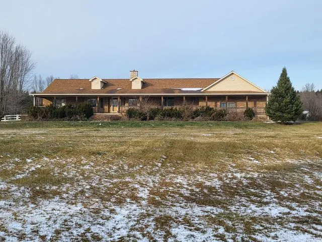 This wonderful 2624 sq. ft. ranch with a full length covered porch and 3 car attached garage sits on a 10 acre parcel less than 1/3 mile from a paved road. It boasts a spectacular 2-sided stone fireplace in the large great room. Also, a master bedroom suite with a jetted tub. The full basement has 9 foot ICF Foam insulated concrete walls and a full bathroom. There is also a full bath in the laundry room near the entrance from the garage The nearby walking/hiking path crosses the back corner of the property. The paved driveway extends all the way to the 42 ft x 76 foot pole barn with electricity and 20 ft sliding doors at each end. There is also an additional 9 acre parcel on the east side of the property that the seller may consider selling. Being sold as is. BATVAI. All measurements are estimated. Information deemed reliable but not guaranteed. This property is in the redemption period and subject to the release of liens.