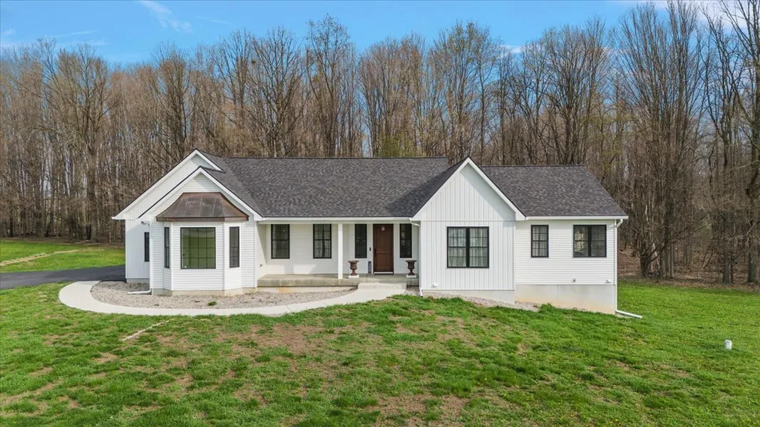 Experience refined living in this custom French Country masterpiece, nestled on 2.71 serene acres at the end of a quiet cul-de-sac in the prestigious Christine Estates. Built in 2023, this stunning residence offers an extraordinary blend of craftsmanship, sophistication, and peaceful seclusion—backing to a wooded preserve and just steps from the tranquil shores of Roods Lake. Spanning 2,100 square feet, this home was thoughtfully designed to showcase architectural elegance and high-end finishes throughout. The stately façade is elevated by a handcrafted copper awning and a custom 8’ front door, making a grand first impression. A winding private drive sets the tone for the luxury and privacy that await within. Step inside to soaring 10-foot ceilings in the main living area, beautifully complemented by imported wide plank French Oak-style luxury vinyl flooring, Benjamin Moore White Dove walls, and a natural gas fireplace with an artisan stone surround. Oversized custom windows flood the home with natural light, offering captivating views of the surrounding forest from every room. The gourmet kitchen is both stunning and functional, adorned with soft-close custom cabinetry, premium granite countertops, and designer lighting. Appliances, including washer/dryer, refrigerator, microwave, and dishwasher, are all included for immediate move-in convenience. The open-concept design flows seamlessly into an inviting dining and living area—ideal for both intimate gatherings and elegant entertaining. The luxurious primary suite is a private haven, featuring a spa-inspired bath with a walk-in European tiled shower, oval soaking tub with a forest view, and a spacious walk-in closet. Two additional bedrooms and 3.5 thoughtfully appointed baths ensure comfort for all. The partially finished lower level boasts Superior Walls construction and includes a full bath, storage room, and a cellar with future wine room potential. A true highlight is the built-in 8-person cedar sauna with tile flooring and integrated Bluetooth sound system