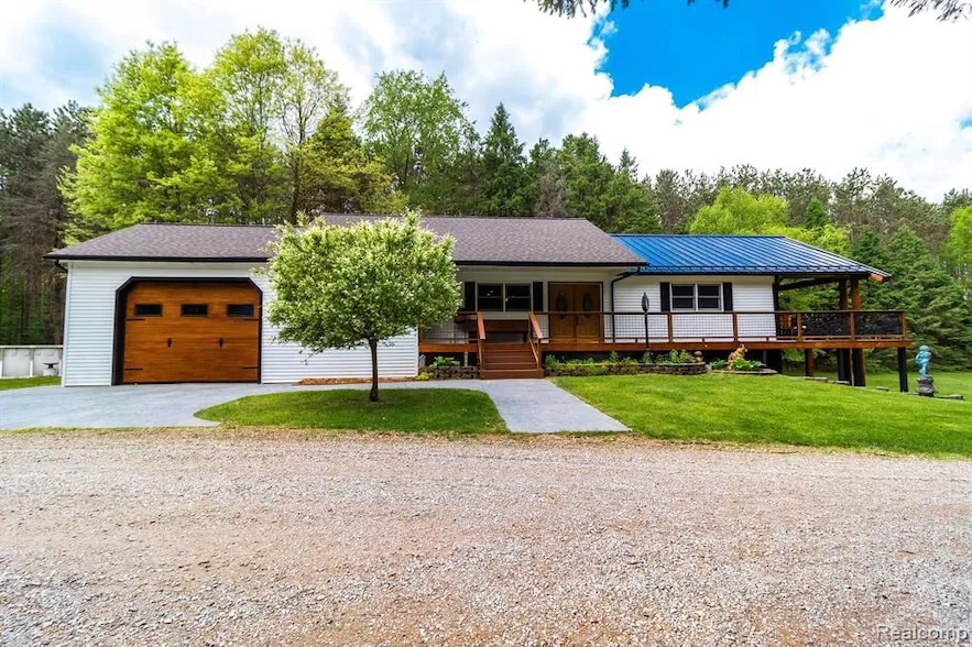 Private Custom Ranch on 4.6 Wooded Acres with Walkout Basement & Pole Barn. Enjoy peace and privacy in this custom 4-bedroom, 2.5-bath ranch nestled on 4.6 wooded acres in Columbiaville, set over 500' off the road in Lapeer Schools. With 3,120+ sq ft of finished space including a walkout lower level, this home features soaring vaulted ceilings, a fire-lit great room, and a spacious kitchen with solid oak finishes and room for a large island. The primary suite includes a jetted tub, walk-in closet, private bath with tiled walk-in shower, and deck access to the pool area. The finished basement offers 2-3 additional bedrooms, a large family room, full bath, and brick paver patio with waterfall feature. A 54x32 heated pole barn with full bath, two storage sheds, and an outdoor wood boiler (with LP backup) complete the package. Highlights include a covered front porch, heated attached garage, and high-end construction throughout. A rare combination of privacy, space, and craftsmanship.