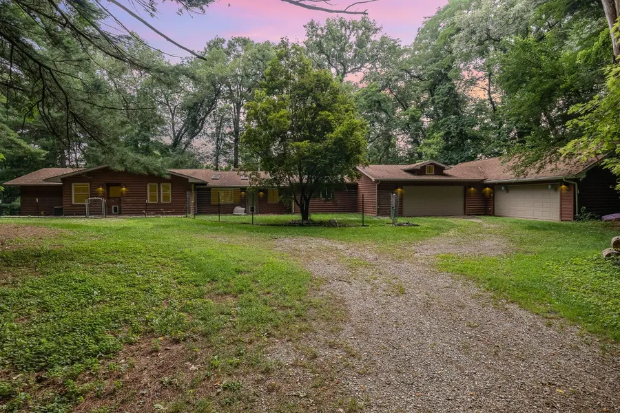 HOUSE IN THE MIDDLE OF THE WOODS, on 5.34 acres. Over 800 feet back, sits this SPECTACULAR Log home just waiting for its new owners to love it. From the moment you step in you will be AWED by the BEAUTIFUL Knotty Pine, Sprawling Ceilings with sky lights. The open concept is very inviting, and SCREAMS Let's entertain. 3 bedrooms, 3 fireplaces, and a living room with fireplace. Kitchen features a wooded vaulted ceiling, an abundance of knotty pine cabinetry, stainless counter tops and appliances. The dinette is adorned with remarkable fireplace. Other amenities include a 2-car garage with a heated breezeway and an ATTACHED POLE BARN, large enough to house another 4 vehicles, and still have plenty of space for a workshop. spacious primary bedroom with a unique on-suite and a spacious secondary bedroom. The lower level offers a recreation room with fireplace and a third bedroom with bath. Peaceful Tranquility as you sip your favorite beverage on the back patio, or the ENCLOSED FRONT PORCH